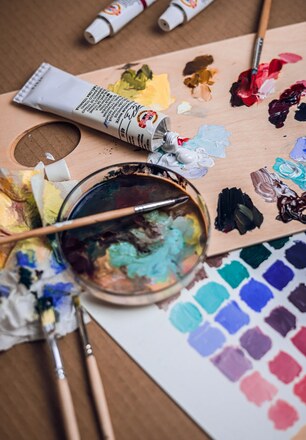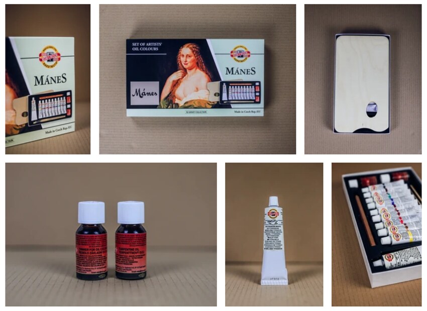 Plátno je připravené, pojďme přejít k samotné malbě! Začátečníkům by se mohla hodit některá z předpřipravených sad, jako je například kazeta Mánes, ve které najdete nejen olejové barvy, ale také titanovou bělobu, olej, ředidlo, štětce, grafitovou tužku a dřevěnou paletu. Jednoduše vše, co budete do svých začátků s olejomalbou potřebovat.