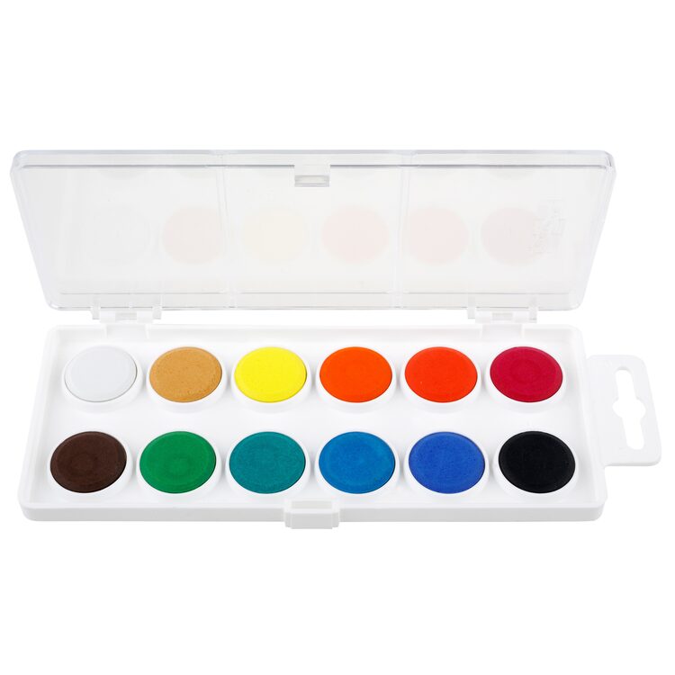 Školní vodové barvy 12ti odstínů s tabletami o průměru 22,5 mm v obdélníkových, plastových, jednopatrových barevnících s transparentním víčkem. Barvy jsou výrazné, vyznačují se svým vysokým obsahem pigmentů. Přečíst si více