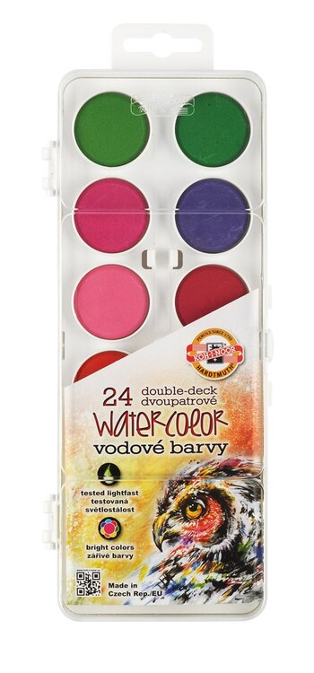 Školní vodové barvy s 24 barevnými tabletami o průměru 30 mm v obdélníkových, plastových, jednopatrových barevnících s transparentním víčkem. Barvy jsou výrazné, vyznačují se svým vysokým obsahem pigmentů. Jsou certifikované a zcela bezpečné pro děti. Přečíst si více