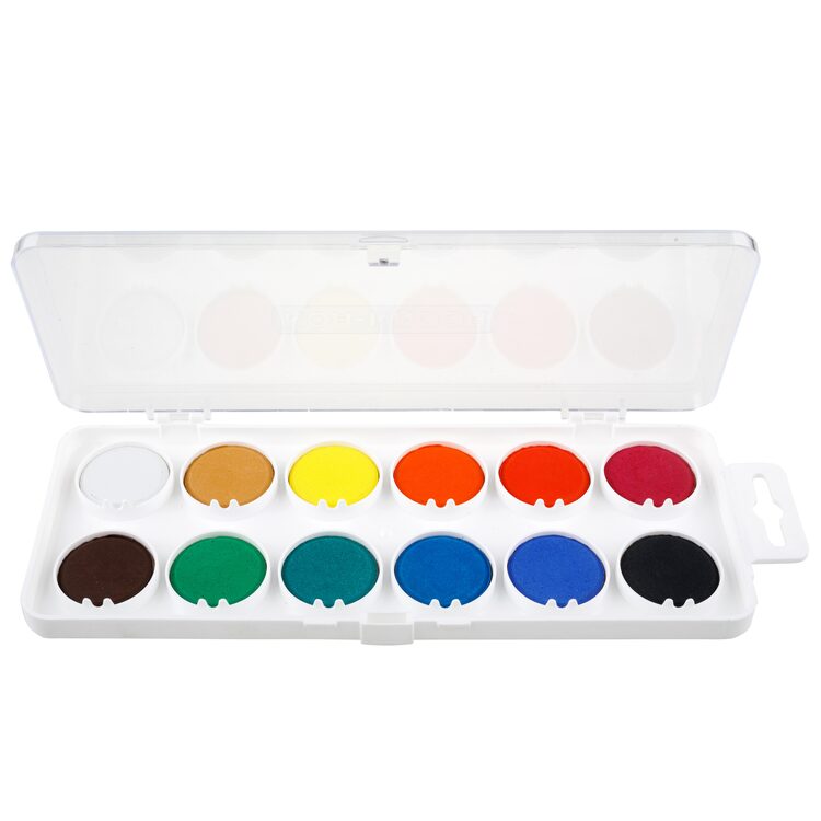 Školní vodové barvy 12ti odstínů s tabletami o průměru 30 mm v obdélníkových, plastových, jednopatrových barevnících s transparentním víčkem. Barvy jsou výrazné, vyznačují se svým vysokým obsahem pigmentů. Jsou certifikované a zcela bezpečné pro děti. Přečíst si více