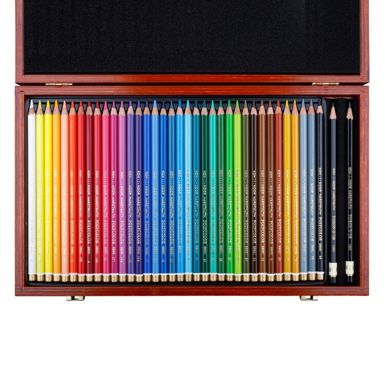 Naše sada pastelek POLYCOLOR nejvyšší kvality je dodávána v krásném dřevěném pouzdře a je dokonalým dárkem pro umělce všech věkových kategorií a úrovní. 36 pastelek nabízejí bohatě pigmentované tuhy a vynikající sytost barev. Mají vynikající schopnosti míchání a vrstvení a zanechávají hladkou a hedvábnou stopu. Šestiúhelníkový tvar poskytuje stabilní úchop pro pohodlné kreslení a precizně zpracované dřevěné pouzdro s jemnou smaltovanou povrchovou úpravou přispívá k celkové kvalitě a odolnosti sady. Sada obsahuje také 2 grafitové tužky 1900 (2B, 5B). Souprava 36 ks špičkových pastelových tužek s kvalitním silně pigmentovaným jádrem o průměru 3,8 mm v dřevěné kazetě. Souprava je doplněna dvěma grafitovými tužkami. Pastelky mají špičkovou povrchovou úpravu, máčený knoflík a zlaté značení. Vyznačují se sytou barevnou stopou s možností kresbu dále upravovat roztíráním. Jsou vhodné pro umělecké a hobby kreslení. Přečíst si více