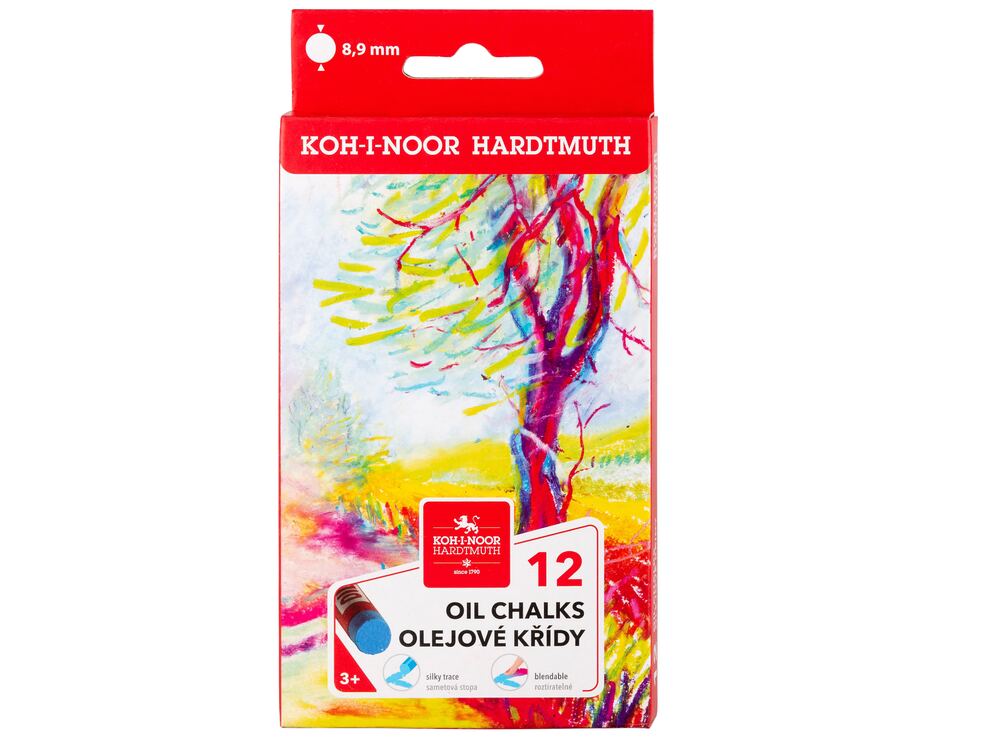 Souprava olejových kříd určených pro školní účely, pro aranžérské a umělecké kreslení. Souprava 12 kusů olejových kříd o rozměrech Ø cca 8,9 mm, délka 60 mm. Každá olejová křída je obalená zavinovacím štítkem červeno-bílým s černo – červeno – bílým textem KOH-I-NOOR HARDTMUTH OIL CHALKS. Přečíst si více