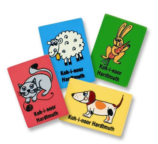 Plastická pryž netvárlivá, vhodná pro stírání grafitových čar. Hranatá, kvádrová, různé barevné modifikace. Rozměr 45 x 31 x 12 mm. Zelená pryž - barevný obrázek zajíce, červená pryž - barevný obrázek kočky, modrá pryž - barevný obrázek ovce, žlutá pryž - barevný obrázek psa. Přečíst si více