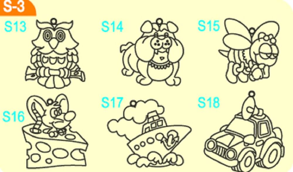 Plastová formička vhodná pro děti. Relief formičky se mohou vyplnit dekorativními barvami nebo modelovací hmotou Bubble foam. Bezbarvá krastenová formička S-3 - černá reliéfní kresba se 6-ti motivy – pes, sova, včela, parník, myš v sýru, auto, do které se maluje nebo se vyplňuje hmotou. Spodní strana hladká, vrchní – černá vystouplá kresba s různými motivy. Rozměry 155 x 65 x 3 mm pro motiv pes, auto myš, 155 x 70 x 3 mm pro motiv sova, včela, parník. Přečíst si více