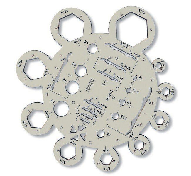 Šablona maticová I vyrobená z kouřovéko průhledného polystyrenu. Je určena pro rýsování matic a šroubů dle ČSN. Výrobek je určen pro práci s ohrocenou tužkou, mikrotužkou nebo technickými pery. Obsahuje R-1; 1,5; 2; 2,5; 3; 4; 5; 6; 7; 8; 10; 11; 12; 14; 16; 18; 20; 22; 25 mm a matice M 2; 3; 4; 5; 6; 8; 10; 12; 16; 20; 24; 30. Všechny otvory a křivky jsou označeny příslušnými údaji pro snadné rozlišení při používání. Označení je provedeno technologií přesného sítotisku, který je při běžném používání odolný proti opotřebení. Šablona je určena k rýsování a technickému kreslení ve škole i v kanceláři. Zabalena je do pelyetylenového sáčku s eurozávěsem. Přečíst si více