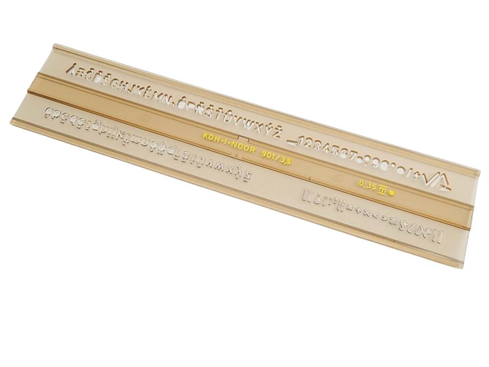 Písmenková šablona vyrobená z kouřového průhledného styroluxu. Je určena pro práci s technickým perem 0,35 mm. Obsahuje znaky velké a malé abecedy, číslic a matematických znaků. Veškeré znaky jsou velikosti 3,5 mm a tvaru kolmého písma dle ČSN. Šablona je určena k popisování ve škole i v kanceláři. Zabalena je do celotransparentního polypropylenového pouzdra s papírovou vložkou a eurozávěsem. Přečíst si více