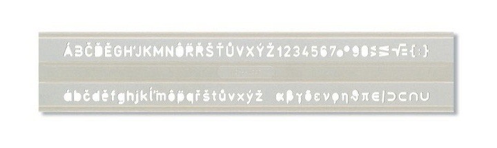 Písmenková šablona vyrobená z kouřového průhledného polystyrenu. Je určena pro práci s ohrocenou tužkou nebo mikrotužkou. Obsahuje znaky velké a malé abecedy, číslic, matematických znaků a řecké abecedy. Veškeré znaky jsou velikosti 5 mm. Šablona je určena k popisování hlavně ve škole, ale i v kanceláři. Zabalena je do polyetylenového celotransparentního sáčku, na kterém je nalepen samolepicí štítek s identifikačními údaji. Přečíst si více