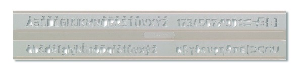 Písmenková šablona vyrobená z kouřového průhledného polystyrenu. Je určena pro práci s ohrocenou tužkou nebo mikrotužkou. Obsahuje znaky velké a malé abecedy, číslic, matematických znaků a řecké abecedy. Veškeré znaky jsou velikosti 7 mm. Šablona je určena k popisování hlavně ve škole, ale i v kanceláři. Zabalena je do polyetylenového celotransparentního sáčku, na kterém je nalepen samolepicí štítek s identifikačními údaji. Přečíst si více