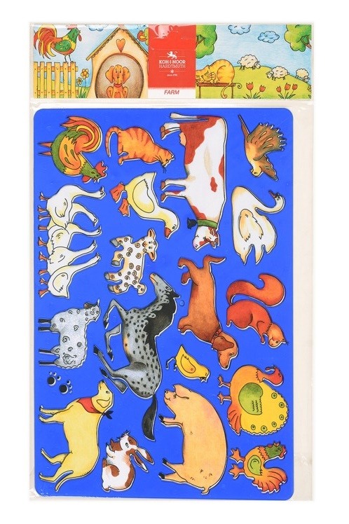 Šablona plastová na kreslení – FARM (motiv “domácí zvířata“), rozměry 265 x 187 mm, tl. 2 mm; uložená v PP sáčku se závěsem. Barva transparentní modrá. Šablona se používá na překreslení motivu na papír. Přečíst si více