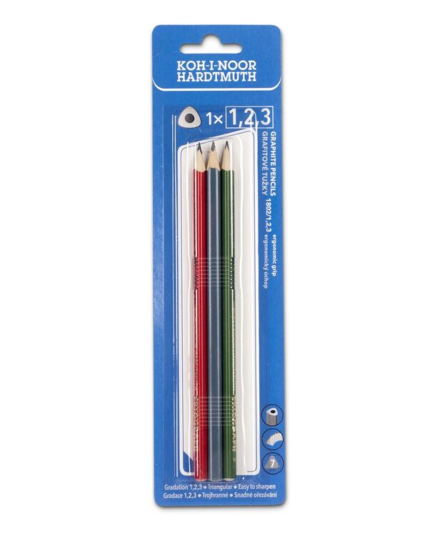 Souprava trojhranných grafitových tužek v gradaci č. 1, 2, 3. Tužky jsou v dřevěném plášti a v zeleném, červeném a šedém lakování, balené po 3 ks mix barev v blistru. Ergonomický trojhranný tvar umožňuje optimální držení a vedení tužky. Jsou určeny pro školáky, děti předškolního věku i pro univerzální použití. Přečíst si více