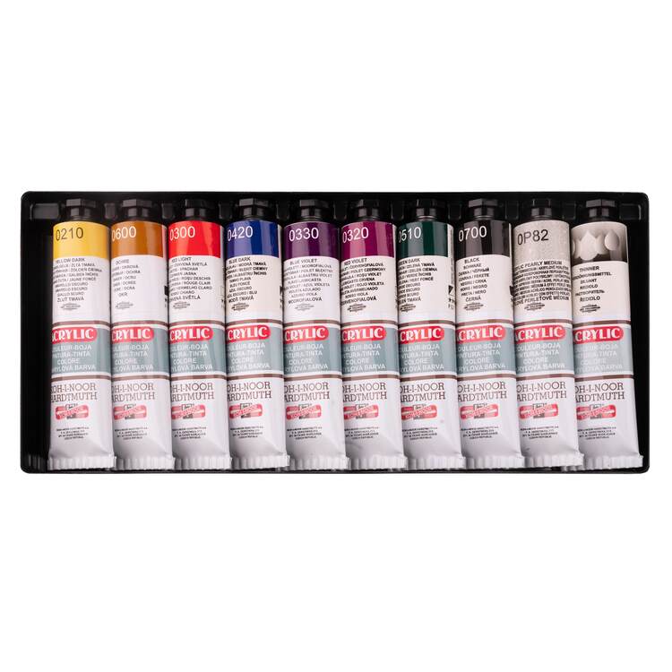 Sada akrylových barev. Vysoce kvalitní pigmenty. Sada obsahuje 10 zářivých odstínů s extra jemnou a krémovou texturou. Barvy se snadno nanášejí štětcem, válečkem nebo špachtlí a lze je snadno míchat. Přečíst si více
