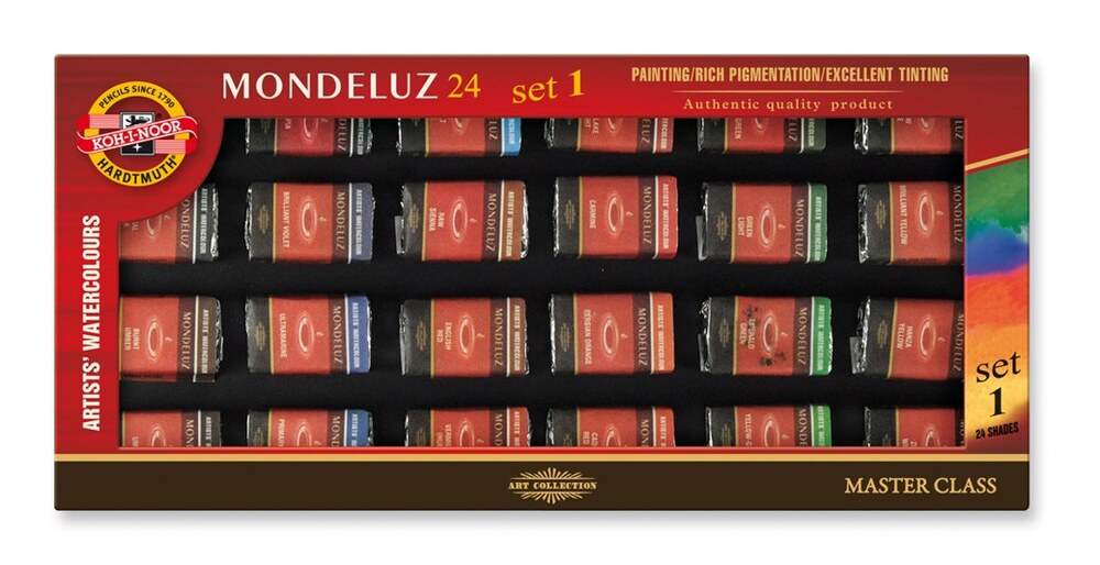 Akvarelové barvy MONDELUZ jsou transparentní s jasnými odstíny, s velmi malou kryvostí určené pro malování vlasovým štětcem technikou akvarelu. Dodávány jsou v pevném stavu ve formě kyvetek z umělé hmoty zabalené v hliníkové fólii označené etiketou. Jejich kvalitativní parametry, týkající se kryvosti, světlostálosti a složení jsou vždy uvedeny na etiketě. Přečíst si více
