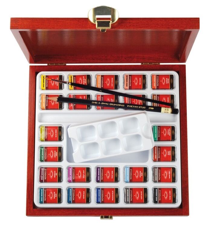 Akvarelové barvy MONDELUZ jsou transparentní s jasnými odstíny, s velmi malou kryvostí určené pro malování vlasovým štětcem technikou akvarelu. Dodávány jsou v pevném stavu ve formě kyvetek z umělé hmoty zabalené v hliníkové fólii označené etiketou. Jejich kvalitativní parametry, týkající se kryvosti, světlostálosti a složení jsou vždy uvedeny na etiketě. Přečíst si více