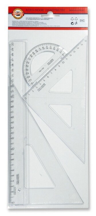 Souprava geometrická velká se skládá z výrobků: trojúhelník 45/177 s kolmicí, trojúhelník 60/250, pravítko 30 cm a úhloměr 180/100. Všechny výrobky jsou vyrobeny z čirého průhledného polystyrenu. Stupnice jsou zhotoveny technologií horké ražby nebo přesného sítotisku. Přesnost délkových stupnic 0,2% délky. Souprava je vhodná pro technické kreslení, rýsování a měření přímek, úseček, rovnoběžek, kolmic, úhlů, apod. ve škole i v kanceláři. Balení je pomocí potištěného přířezu z mikrovlny, na kterém jsou výrobky uloženy a zavařeny do filutexové smršťovací folie. Přířez je opatřen eurozávěsem. Přečíst si více