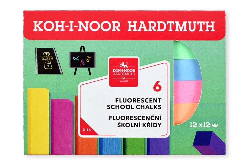 Souprava 6 kusů školních fluorescenčních čtyřhranných kříd o rozměrech 12x12x100 mm, které jsou určeny pro psaní na školní tabule nebo chodníky a jiné asfaltové či betonové plochy, vložených do krabičky s potištěnou manžetou. Přečíst si více