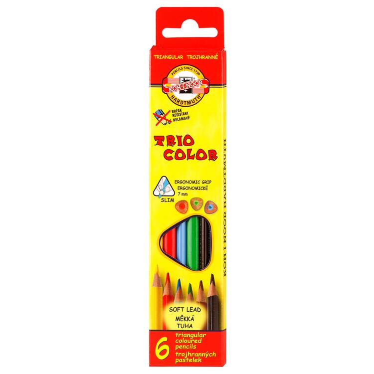Trojhranné pastelové tužky v dřevěném plášti. 6 barev baleno do kartonové krabičky. Ergonomický trojhranný tvar umožňuje optimální držení a vedení tužky. Jsou určeny jak pro školáky tak i děti předškolního věku. Tyto tužky získávají stále větší oblibu. Přečíst si více