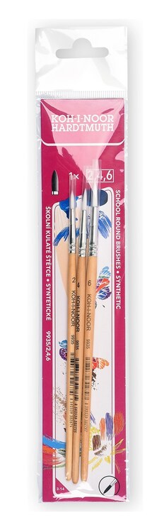 Kulatý štětec syntetický je určený pro školní účely. Je to sada 3 ks kulatých štětců. Velikosti štětců jsou č. 2, 4 a 6. Mají přírodní lakovaný dřík, syntetický bílý vlas a toulec z hliníku. Vlas je dlouhý 12, 14 a 17 mm, průměr vlasu je 2,3, 2,7 a 3,4 mm a rukojeť je dlouhá 135 mm. Vlas je lepený a je chráněn plastovou krytkou, která zabrání poškození vlasu. Vlas je díky lepení vytvarován do špičky, a proto se dá použít k vybarvování i obtahování i velmi tenkých věcí. Štětce jsou uloženy v plastovém sáčku s eurozávěsem, uvnitř mají potištěnou papírovou vložku. Rozměr soupravy s eurozávěsem 280 x 50 x 10 mm. Přečíst si více