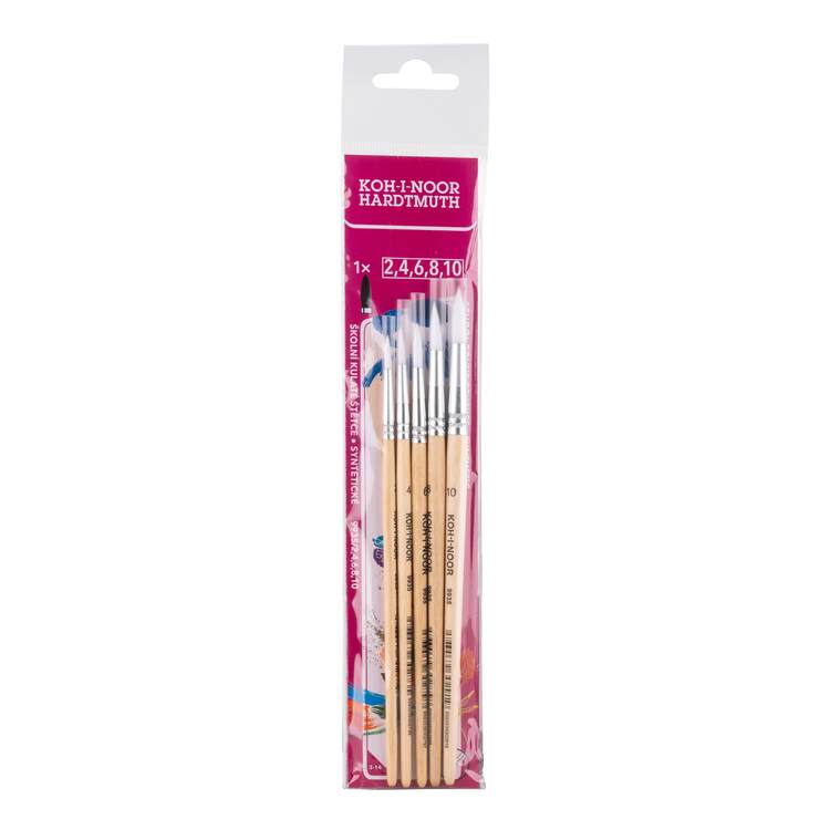 Kulatý štětec syntetický je určený pro školní účely. Je to sada 5 ks kulatých štětců. Velikosti štětců jsou č. 2, 4, 6, 8 a 10. Mají přírodní lakovaný dřík, syntetický bílý vlas a toulec z hliníku. Vlas je dlouhý 12, 14, 17, 19 a 23 mm, průměr vlasu je 2,3, 2,7, 3,4, 4,5 a 5,3 mm a rukojeť je dlouhá 135 mm. Vlas je lepený a je chráněn plastovou krytkou, která zabrání poškození vlasu. Vlas je díky lepení vytvarován do špičky, a proto se dá použít k vybarvování i obtahování i velmi tenkých věcí. Štětce jsou uloženy v plastovém sáčku s eurozávěsem, uvnitř mají potištěnou papírovou vložku. Rozměr soupravy s eurozávěsem 280 x 50 x 10 mm. Přečíst si více