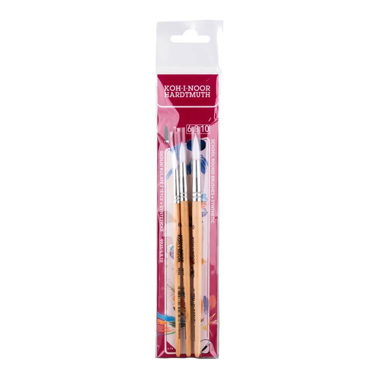 Kulatý štětec syntetický je určený pro školní účely. Je to sada 3 ks kulatých štětců. Velikosti štětců jsou č. 6, 8 a 10. Mají přírodní lakovaný dřík, syntetický bílý vlas a toulec z hliníku. Vlas je dlouhý 17, 19 a 23 mm, průměr vlasu je 3,4, 4,5 a 5,3 mm a rukojeť je dlouhá 135 mm. Vlas je lepený a je chráněn plastovou krytkou, která zabrání poškození vlasu. Vlas je díky lepení vytvarován do špičky, a proto se dá použít k vybarvování i obtahování i velmi tenkých věcí. Štětce jsou uloženy v plastovém sáčku s eurozávěsem, uvnitř mají potištěnou papírovou vložku. Rozměr soupravy s eurozávěsem 280 x 50 x 10 mm. Přečíst si více