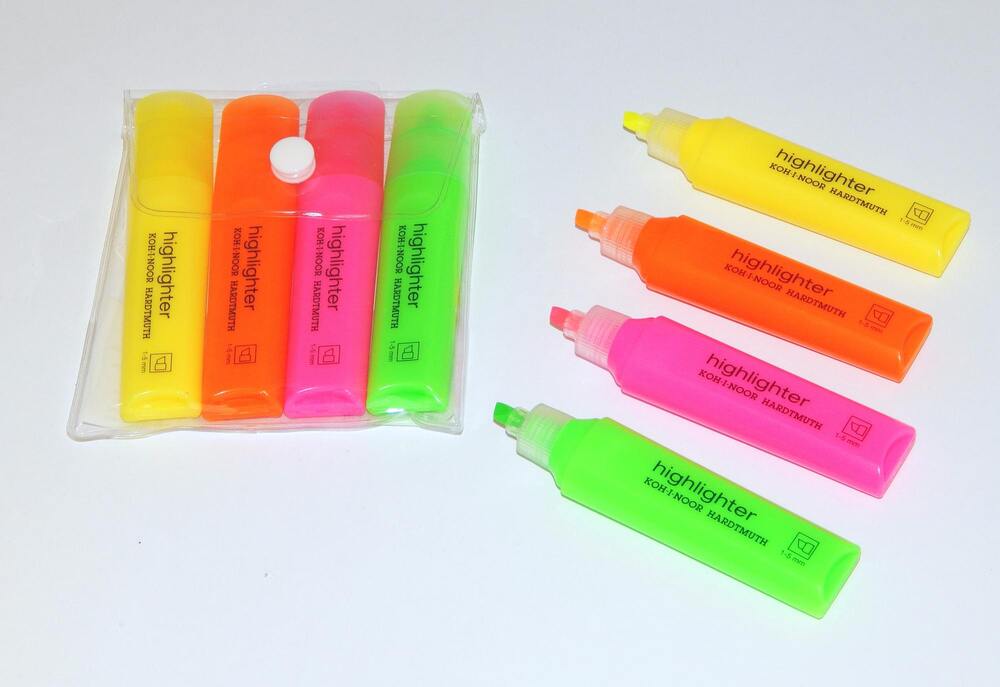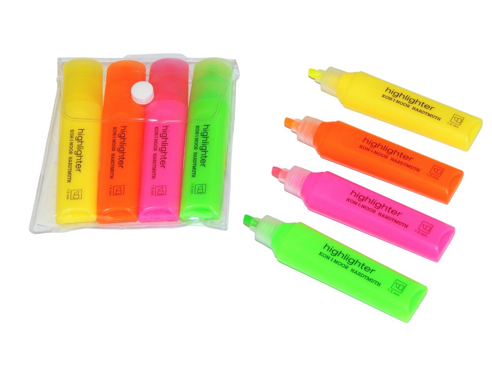 Souprava 4 ks popisovačů barva: žlutá, oranžová, růžová a zelená.Klínový hrot o šířce 4,8 mm, je odolný proti zatlačení, šířka stopy 1 – 5 mm. Vypratelný inkoust na vodní bázi, nepropíjí se skrz papír. Plastový plášť zvýrazňovačů včetně víčka je vždy v barvě inkoustu. Přečíst si více