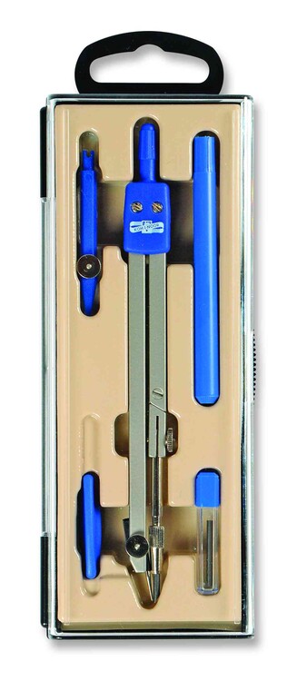 Souprava kružidel, 5 dílná, v obalu z tvrdého plastu s průhledným víkem a eurozávěsem obsahuje kružidlo kovové, násadku, pero kružidla, tuženku a šroubovák s držákem, je určena pro rýsování na základních školách. Slouží k rýsování kružnic pr. 5-400 mm tuhou nebo tuží a čar tuží o šířce 0,35-0,8 mm, upínací průměr pro výměnné jednotky 3,5 mm. Ramena kružidla a koleno jsou výlisky ze Zn v metalíze imitace Ni, kovové díly niklované, plastové díly - assort barev - jsou vždy v barvě závěšky kružidla - červená, černá, zelená, modrá a lila. Koleno kružidla umožní lepší nastavení kružidla a tím zvýší komfort rýsování. Přečíst si více