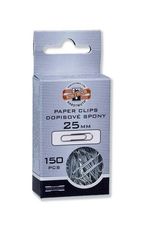 Dopisové spony 25 mm, průměr drátu 1,60 mm, délka 25 mm, šířka 6 mm. Drát je z pokoveného zinku, 150 ks spon je uloženo v papírové krabičce. Spony se používají např. na sepnutí více kusů papírů. Přečíst si více