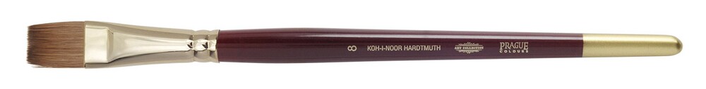 Plochý štětec určený pro umělecké účely. Plochý umělecký štětec, velikost č. 8, vlas kolínský určen pro vodové barvy. Na vlasech štětce je plastová krytka, jako chránítko před roztřepením vlasů. Dřevěné držadlo je ve vínově červeném provedení, na konci štětce máčení v odstínu toulce. Dřík dřevěný, toulec mosazný – odstín zlatý, bezešvý, vlas „kolínský – lasice“. Celková délka štětce: 202 mm, délka vlasu: 19 mm, šířka vlasu: 14 mm. Přečíst si více