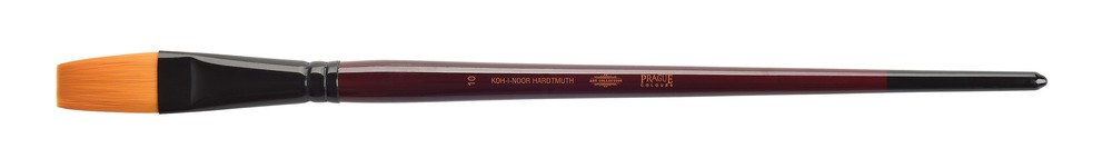 Plochý štětec syntetický je určený pro umělecké účely. Velikost štětce č. 10. Štětec má přírodní lakovaný dřík ve vínově červené barvě, syntetický oranžový vlas a toulec z hliníku, černě lakovaný. Na konci štětce je černé máčení v odstínu toulce. Štětec je vhodný pro akrylové barvy. Štětec je dlouhý 343,7 mm. Délka vlasu je 47 mm. Přečíst si více