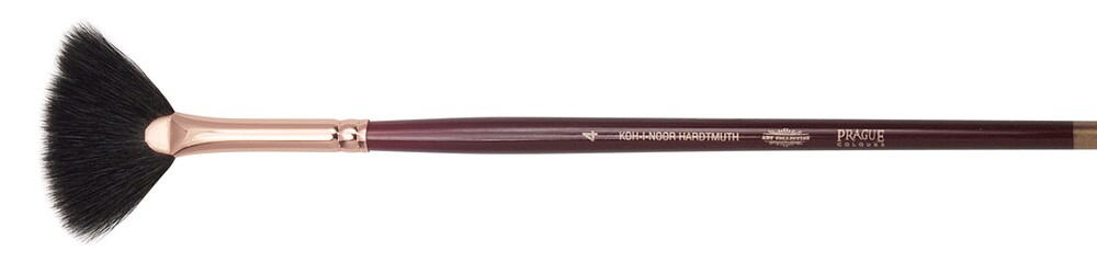 Vějířovitý štětec určený pro umělecké účely. Vějířovitý umělecký štětec, velikost č. 4, chlup veverka určen pro vodové barvy a kvaš. Dřevěné držadlo je ve vínově červeném provedení, na konci štětce máčení v odstínu toulce. Dřík dřevěný, toulec mosazný – odstín měděný, bezešvý, chlup „veverka“. Celková délka štětce: 194 mm, délka vlasu: 18 mm, šířka štětin (měřeno v horní části štětin vějíře): 41 mm. Přečíst si více