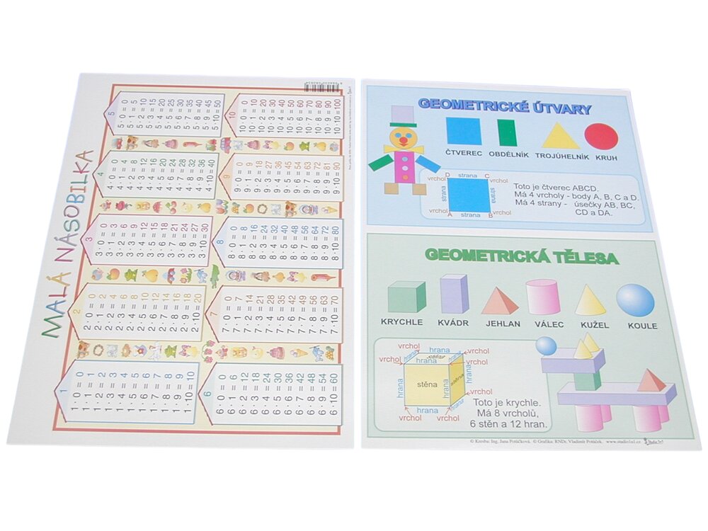 Výuková tabulka NÁSOBILKA / GEOM. TVARY A4 je praktická oboustranná pomůcka pro žáky základních škol, která přehledně zobrazuje násobilku a základní geometrické tvary; formát A4 s jasným a srozumitelným uspořádáním usnadňuje procvičování matematiky ve škole i při domácí přípravě. Přečíst si více