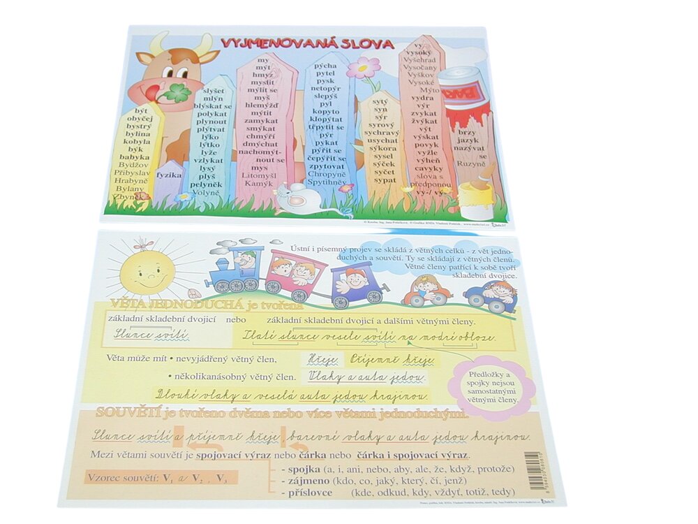 Výuková tabulka VYJMENOVANÁ SLOVA / SKLADBA VĚT A4 je přehledná pomůcka určená pro žáky základních škol, která usnadňuje procvičování českého jazyka; na formátu A4 nabízí jasně strukturovaný přehled vyjmenovaných slov i základních pravidel skladby vět, což pomáhá při domácí přípravě i školní výuce. Přečíst si více
