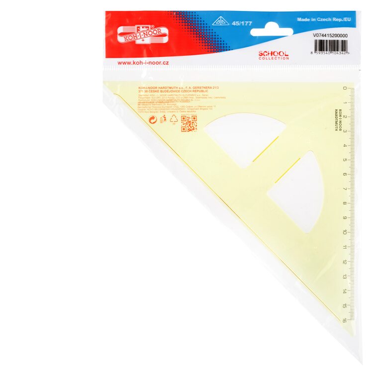 Trojúhelník 45/177 s kolmicí vyrobený ze žlutého průhledného polystyrenu. Stupnice je naražena technologií horké ražby. Přesnost stupnice 0,2% délky. Mimo délkové stupnice je vybaven i ryskou pro konstruování kolmic. Trojúhelník je určený k rýsování a technickému kreslení ve škole i v kanceláři. Zabalen je do potištěného polypropylenového sáčku s eurozávěsem. Přečíst si více