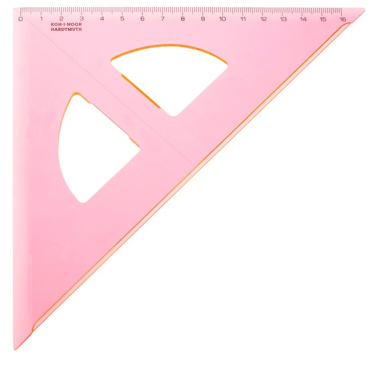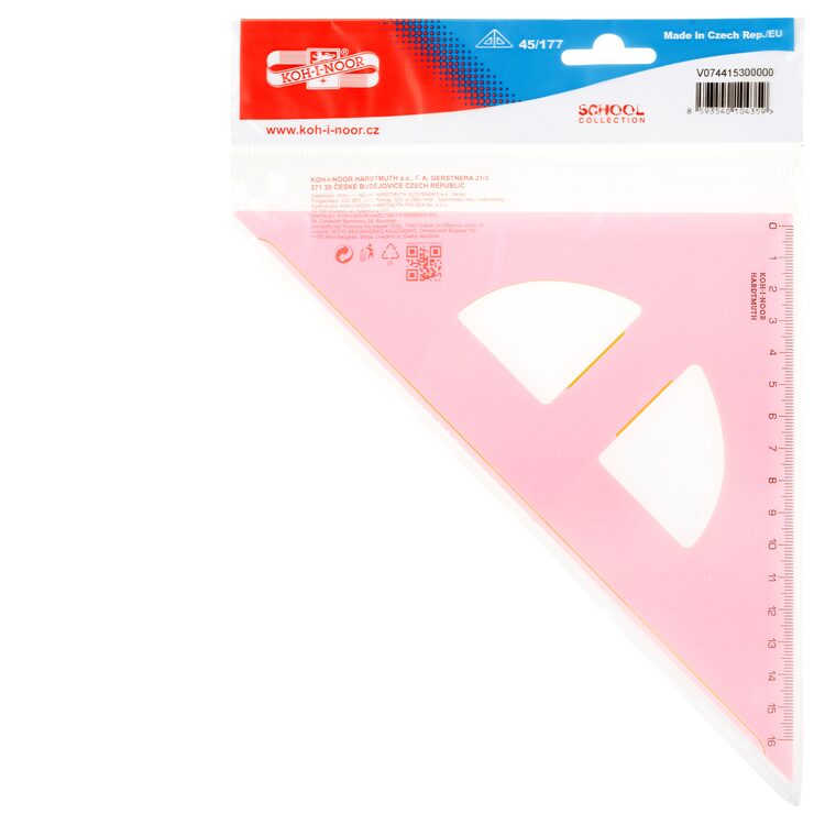 Trojúhelník 45/177 s kolmicí vyrobený z růžového průhledného polystyrenu. Stupnice je naražena technologií horké ražby. Přesnost stupnice 0,2% délky. Mimo délkové stupnice je vybaven i ryskou pro konstruování kolmic. Trojúhelník je určený k rýsování a technickému kreslení ve škole i v kanceláři. Zabalen je do potištěného polypropylenového sáčku s eurozávěsem. Přečíst si více