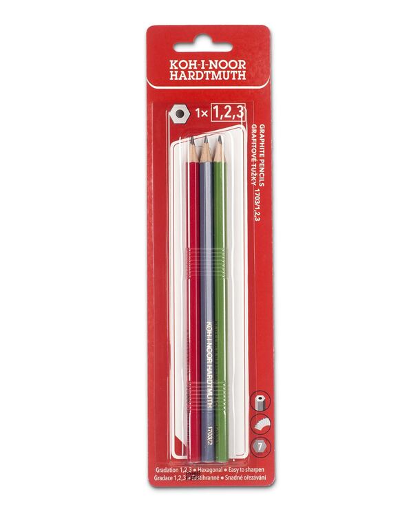 Souprava šestihranných grafitových tužek v gradaci č. 1, 2, 3. Tužky jsou v dřevěném plášti a v červeném, šedém a zeleném lakování. Balené po 3 ks (mix gradací) do blistru. Tužky jsou vhodné jak pro školáky tak i pro univerzální použití. Přečíst si více