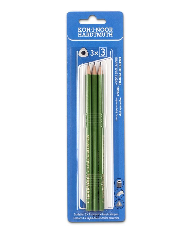 Sada trojhranných grafitových tužek v gradaci č.3. Tužky jsou v dřevěném plášti a v zeleném lakování, balené po 3 ks v blistru. Ergonomický trojhranný tvar umožňuje optimální držení a vedení tužky. Jsou určeny pro školáky, děti předškolního věku i pro univerzální použití. Přečíst si více