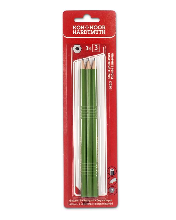 Souprava šestihranných grafitových tužek v gradaci č.3. Tužky jsou v dřevěném plášti a v zeleném lakování. Balené po 3 ks jedné gradace do blistru. Tužky jsou vhodné jak pro školáky tak i pro univerzální použití. Přečíst si více