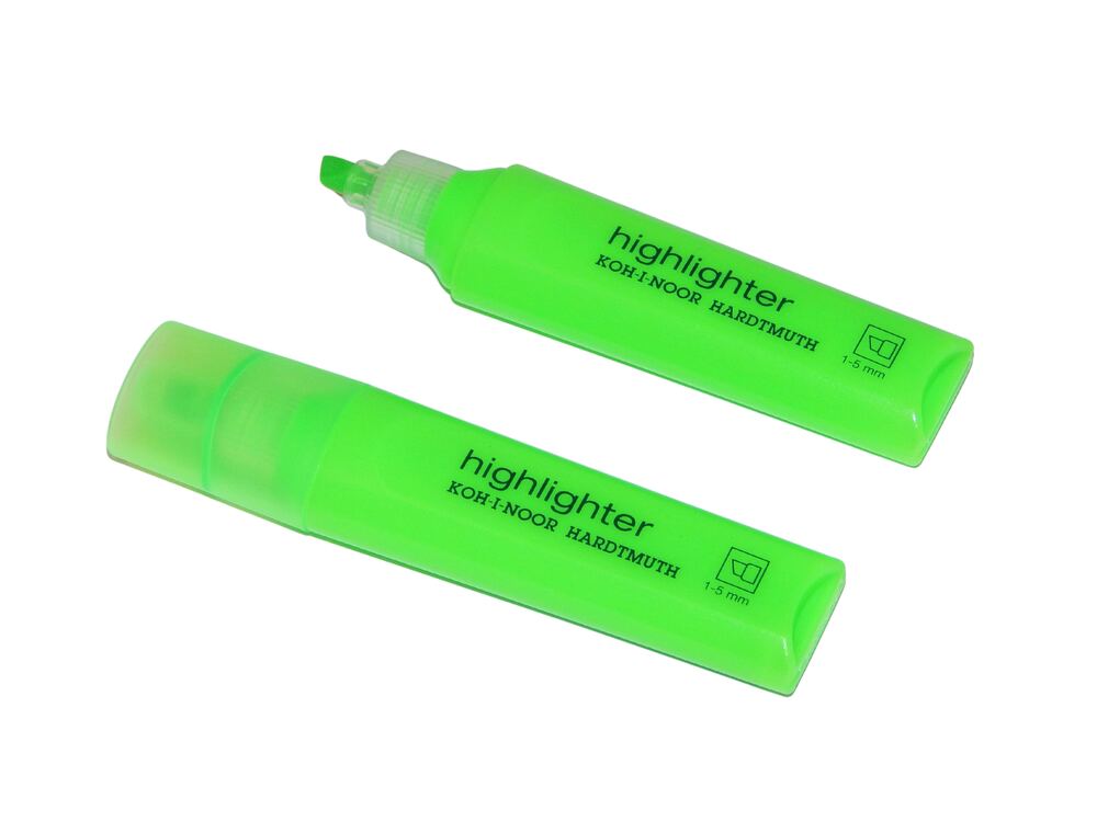 Zvýrazňovač s klínovým hrotem o šířce 4,8 mm, odolný proti zatlačení, šířka stopy 1 – 5 mm. Inkoust na vodní bázi v zelené barvě, vypratelný, nepropíjí se skrz papír. Plastový plášť zvýrazňovače včetně víčka jsou v barvě inkoustu. Přečíst si více
